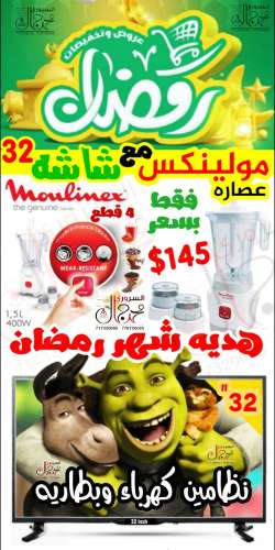 🚨 عصاره مولينكس وشاشه 32 مجاناً 🚨 عروض وتخفيضات شهر رمضان المبارك عصاره مولينكس العالميه 4 قطع قدره المحرك 400 وات وكمان شاشه 32 بوصه فل اتش دي نظامين كهرباء وبطاريه رأسا مباشر اقتصادي جدا في الاستهلاك وكمان السعر شامل التوصيل مجاناً فتره العرض السعر القديم قبل الخصم 185 دولار السعر بعد الخصم تبع العرض 145 دولار او 550 ريال سعودي او 80 الف عمله قديمه او 185 الف عمله جديده (شاشات - غسالات - ثلاجات - افران - مكبرات صوت - مكائن خياطه - عصارات - مراوح - مكائن حلاقه رجالي - نتافات - مملسات نسائي) لدينا مندوبين في المحافظات وكمان اسعار خاصه وخصومات وتخفيضات وهدايا مجاناً وعمولات للمسوقات والتاجرات اتبع هذا الرابط لمشاهدة الكتالوج الخاص بنا في واتساب:
