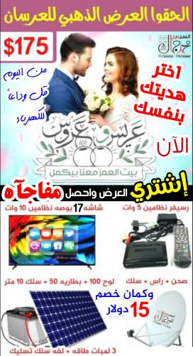 🚨 منظومه طاقه متكامله وهديه مجاناً 🚨 عروض العرسان اختر هديتك بنفسك اشتري لوح 100 وات وبطاريه 50 امبير اسيت ولمبات ولفه سلك ولمبات وشاشه 17 بوصه ورسيفر وصحن وسلك وراس واحصل على هديه اختياريه مجاناً كل هذا فقط بسعر 175 دولار أو 670 ريال سعودي أو 100 الف ريال عمله قديمه أو 215 الف ريال عمله جديده ( أشتري العرض واحصل على خصم 15 دولار ) لدينا مندوبين في المحافظات لمشاهده عروضنا (شاشات - غسالات - مكائن خياطه - عصارات - مراوح - مكائن حلاقه رجالي - نتافات ومملسات نسائي) اتبع هذا الرابط لمشاهدة الكتالوج الخاص بنا في واتساب: