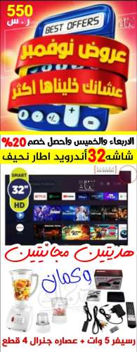 🚨 شاشه سمارت اطار نحيف وعصاره ورسيفر مجاناً 🚨 عروض نوفمبر أشتري شاشه 32 سمارت واي فاي أندرويد ذكيه اطار نحيف الشكل الجديد واحصل على هديتين مجانيتين الأولى ( عصاره 4 قطع الاصلي نحاس ) وكمان ( رسيفر 5 وات ) كل هذا فقط بسعر 550 ريال سعودي أو 82000 عمله قديم أو 170 الف عمله جديده ( اشتري العرض الاربعاء والخميس واحصل على خصم 20٪ في المائه )