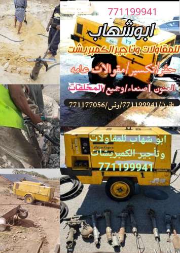 كمبريشنات للايجار كمبريش للايجار الحفريات ومقاولات الهدام (حفر بيارات .... تكسير صبيات .. هدم عمائر ... حفر القواعد والاساسات ... حفر الخزانات ... البدرومات... تعديل الارضي ... وجميع اعمال التكسيرات ) ابو شهاب رقم الجوال 771199941 يوجد تاجير الكمبريشان كمبريشانات