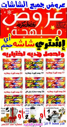 🚨 50 بوصه أندرويد وكساره الجليد مجاناً 🚨 عروض وتخفيضات شهر رمضان المبارك في اسعار جميع الشاشات أشتري شاشه أي حجم من الاحجام الموضحه في صوره العرض واحصل على هديه اختياريه مجاناً هديه رقم 1 قدر ضغط 11 لتر أو هديه رقم 2 كساره الجليد 4500 وات أو هديه رقم 3 عصاره ضد الكسر مع الفاتوره والضمان لمده خمس سنوات ملاحظه/ كل شاشه مكتوب عليها السعر بالريال السعودي اتبع هذا الرابط لمشاهدة الكتالوج الخاص بنا في واتساب:
